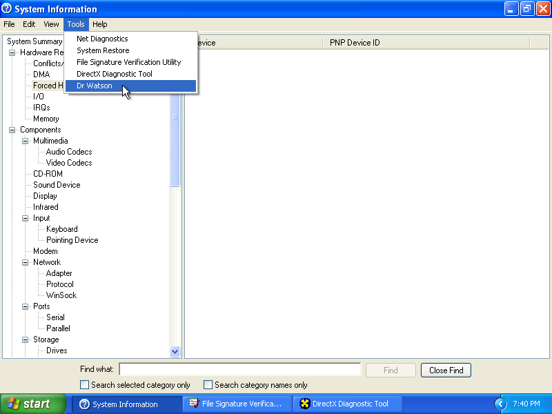 | System Information app sporting "Dr Watson" in a menu overlapping to show the "Forced H" of "Forced Hardware". Somebody somewhere is really running this as a problem. So don't be born having Dr. Watson's initials, I guess. Seems important.. | ![]() | ||